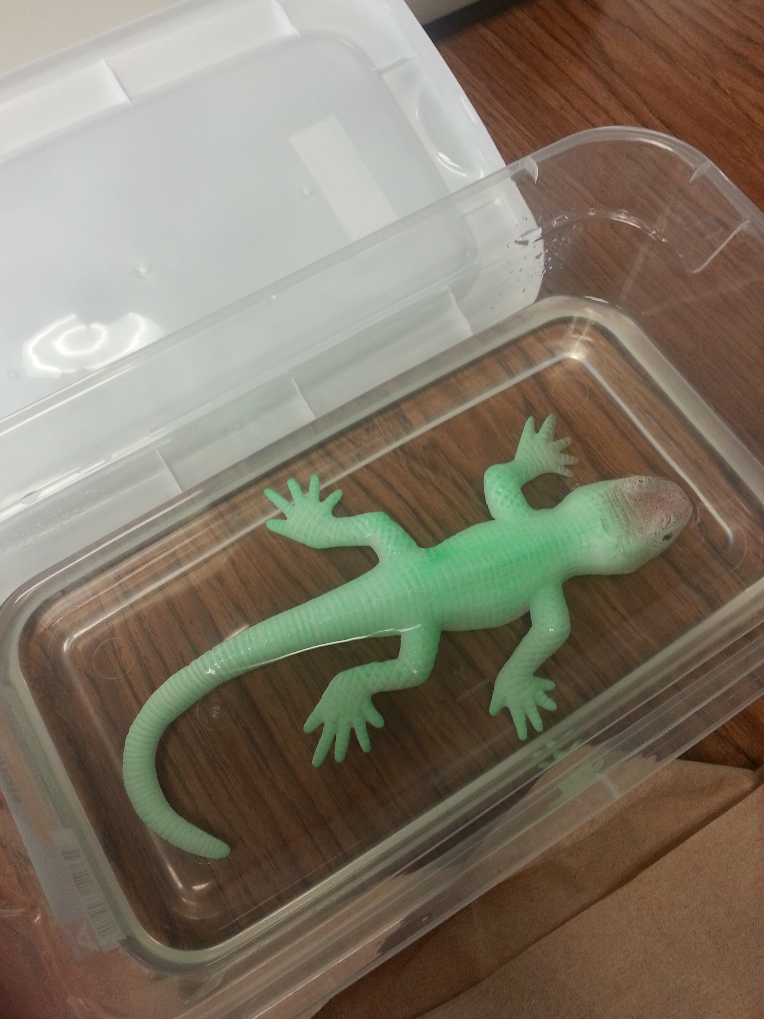 3. Fill up the clear jar/bin with water and place a lizard.