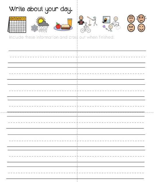 For some students, IEP goal was written around this daily activity: Given sentence frames and visual cues, Jon will attend to a daily journal writing activity based on his day with 80% accuracy for 4 out of 5 trials as measured by work sample and data collection.