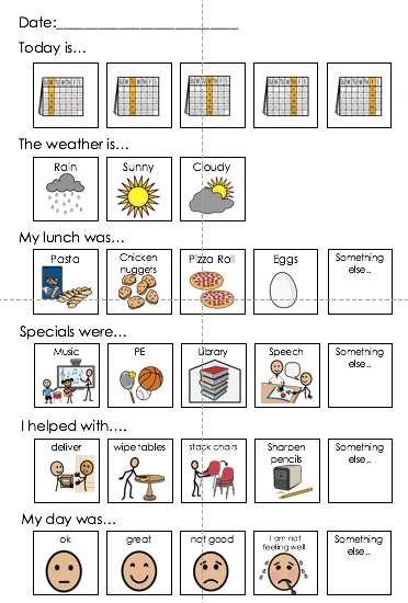 There are 3 different levels of writing templates. Level 1 gives a student several choices in each part of his day. What is it today? What the weather? What did you eat for lunch?…and special activity?
