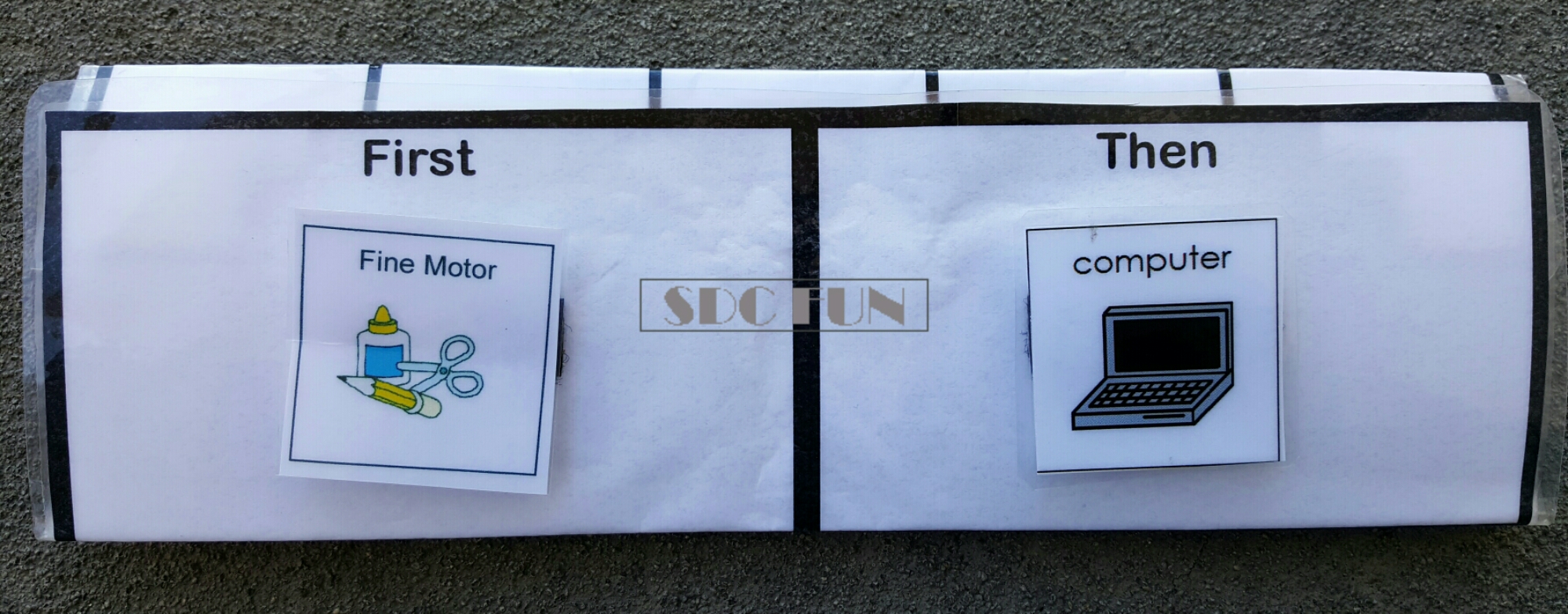 I point to each icon while saying simply, “First Fine Motor and then computer”