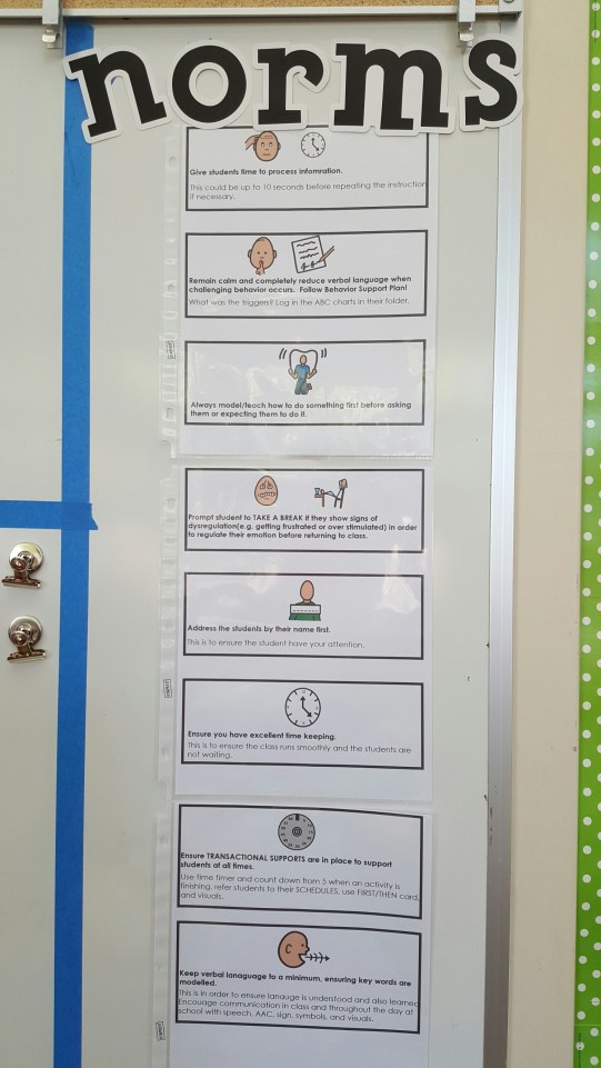 Autism classroom rules and norms were discussed and created by the team members including the students and it is important to display where everyone can see and refer.