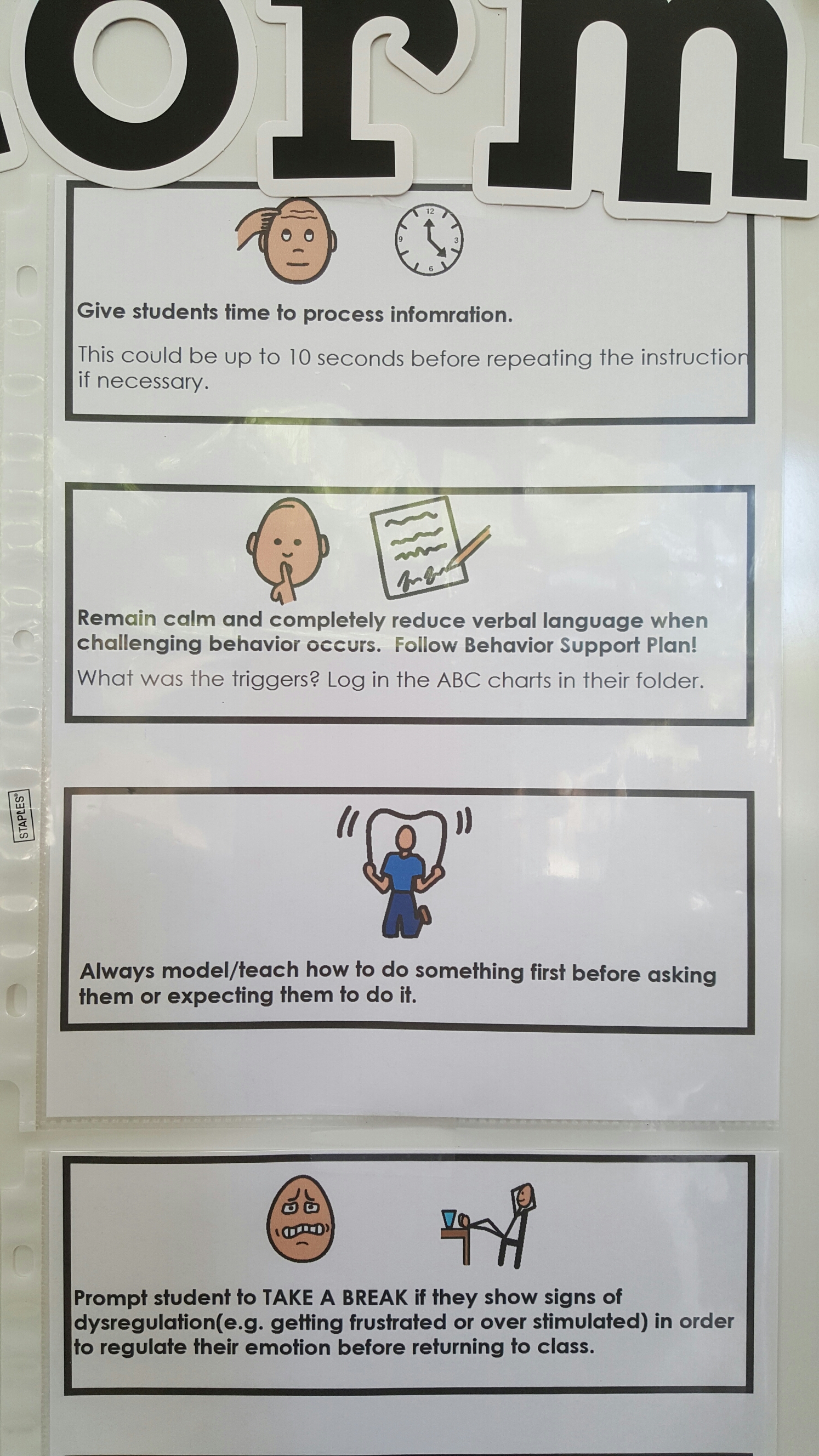 - Remain calm and completely reduce verbal language when challenging behaviors occur.