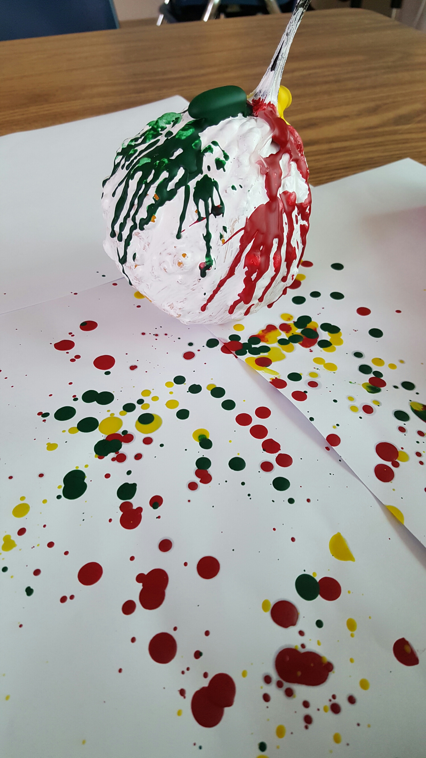 Ok- It was a highlight of this week! All we need was, a couple of pumpkins, crayons(better with ready-to-be thrown away) and a hair dryer. What a cool art project- We began the process with small sized orange pumpkins- some had to be colored white or something else..for the vivid colors after dripping. More importantly, covering up the surface with a solid color is something any kids can do independently.