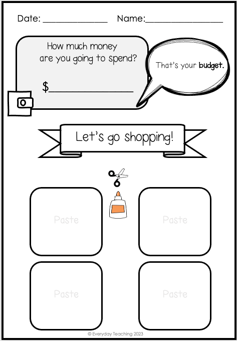 First, we role-played shopping in the grocery store and talked about what the budget means. We then flip through the ads to find and make our own grocery list using one of the worksheets.