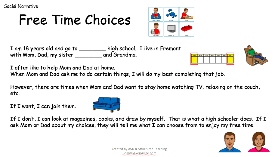 Reading a social narrative can be useful to help the client engage in socially appropriate behavior during unstructured free time.