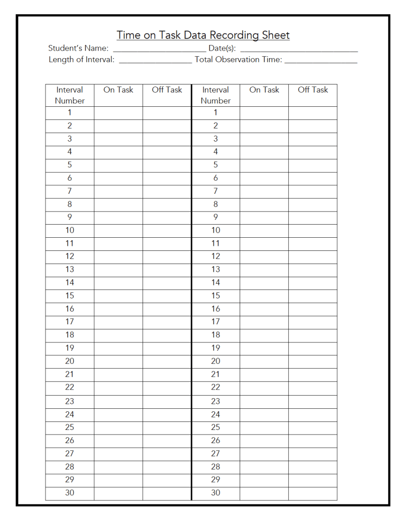If a child struggles to be on task, start collecting the baseline with the Time on Task Datasheet. You can decide the length of the interval (e.g., 20 seconds, 60 seconds) first and observe a child can stay on task the whole time during the interval (whole interval). It’s to identify the baseline.