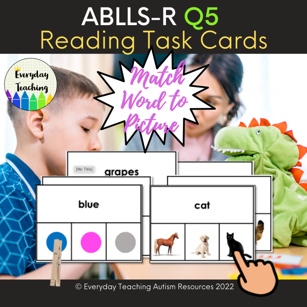 This task card is aligned to ABLLS-R, Q5 Matching Words to Pictures. Students will read the word, and point or put a cloth pin to respond. It’s a perfect autism resource for special education teachers, ABA therapists, and homeschool teachers to work on reading simple words. Simply, print out and laminate these cards for durability. Total 108 words (with real pictures) included.