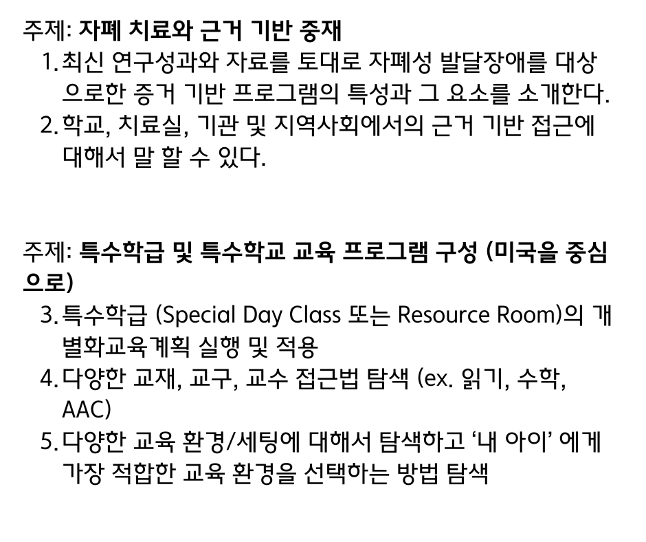 These programs integrate evidence-based practices, disability studies perspectives, and practical strategies that can be applied immediately in schools, clinics, and homes. All workshops can be offered in Korean and English, making them accessible to diverse audiences.